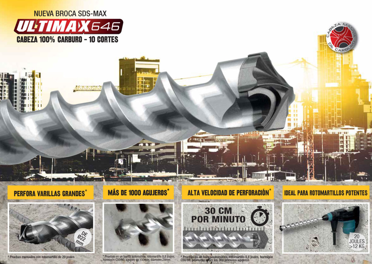 • La cabeza compacta masiva y monbloc de la nueva broca ULTIMAX 646 tiene 10 cortes activos y el 50% de masa de carburo adicional.